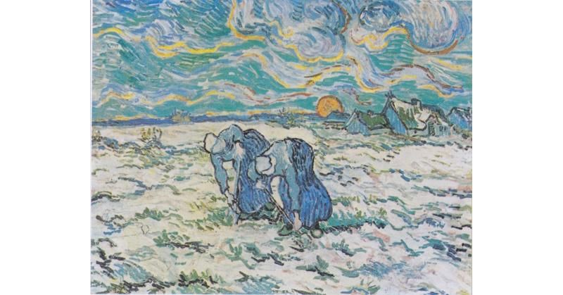 ▎梵谷(Vincent Willem van Gogh),《夕陽下兩位農婦開掘積雪覆蓋的田地》(Deux Paysannes,1890)。